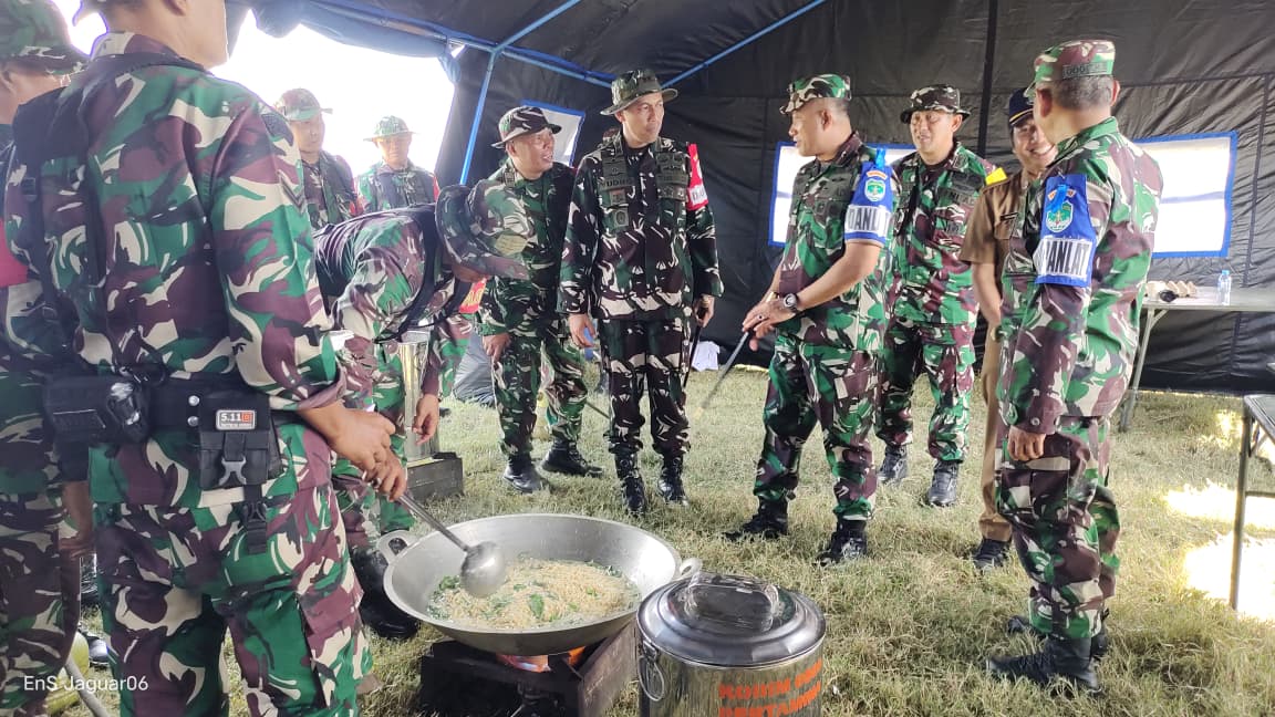 Pada peninjauan tersebut, Danrem 052/Wkr memberikan bantuan Sembako kepada masyarakat sekitar daerah latihan. Pelaksanaan