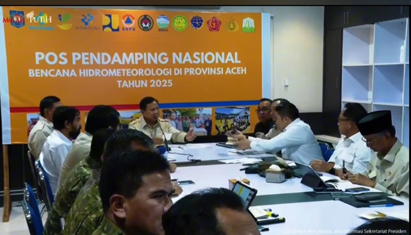 JACKTVNEWS.COM ||Aceh Besar Usai meninjau langsung kondisi terdampak bencana di sejumlah lokasi di Aceh, Presiden Prabowo Subianto memimpin rapat terbatas (ratas) mengenai penanganan dan pemulihan bencana yang melanda Aceh, Sumatera Utara, dan Sumatera Barat. Ratas tersebut berlangsung di Pos Pendamping Nasional Penanganan Bencana Alam Aceh yang berlokasi di Pangkalan TNI AU Sultan Iskandar Muda, Aceh Besar, Minggu (07/12/2025).